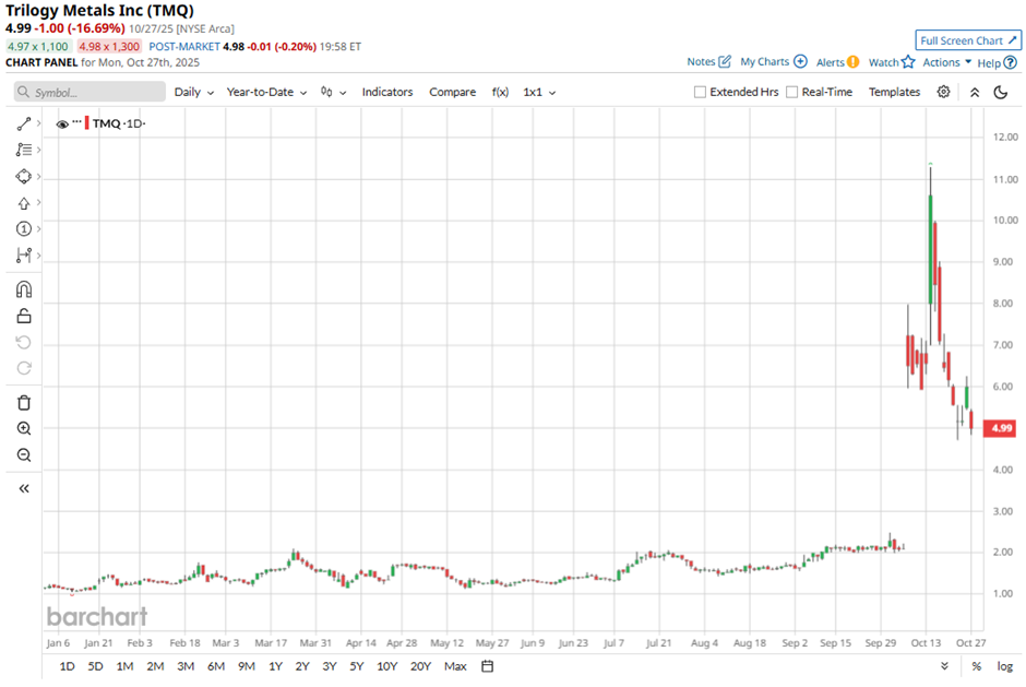 Trilogy Metals’ share price has experienced dramatic appreciation this year. From trading a little over $1 in early 2025, the stock surged past $10 recently, following major government-backed developments.
