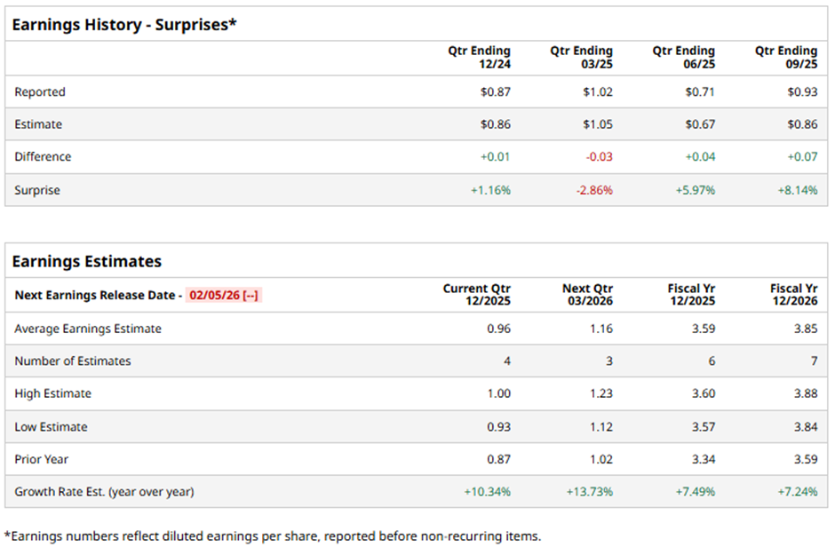 The Jackson, Michigan-based company is set to announce its fiscal Q4 2025 results soon. Ahead of this event, analysts forecast CMS to report an adjusted EPS of $0.96, up 10.3% from $0.87 in the year-ago quarter. It has surpassed Wall Street's earnings estimates in three of the last four quarters while missing on another occasion.