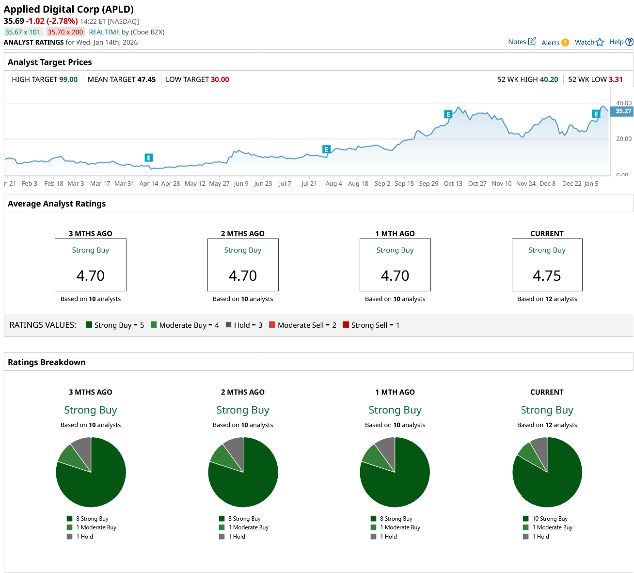 Overall, Wall Street remains optimistic about APLD stock with a “Strong Buy” rating. Of the 12 analysts covering the stock, 10 rate it a “Strong Buy,” one rates it a “Moderate Buy,” and one rates it a “Hold.”