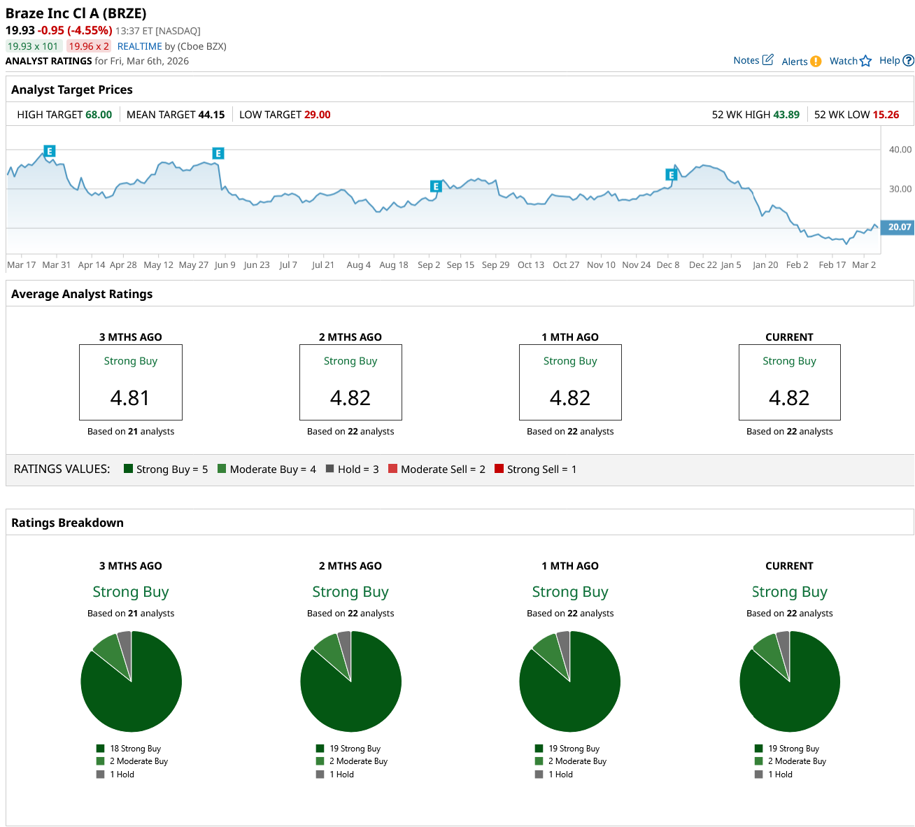 Overall, Wall Street rates BRZE stock a “Strong Buy.” Of the 22 analysts covering Braze's stock, 19 rate it a “Strong Buy,” while two recommend a “Moderate Buy,” and one recommends a “Hold.”
