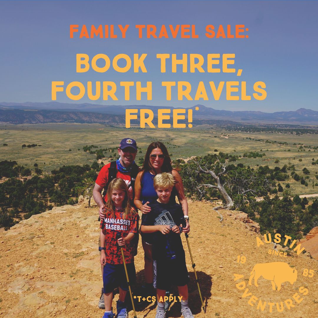Now through January 31, 2023, Austin Adventures is offering a book three, fourth travels free promotion on family trips departing before June 30, 2023. The offer is valid through phone and/or online reservations (Note: terms apply, see the complete list of terms and conditions here).