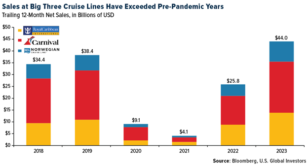 Greater demand for leisure travel has resulted in higher revenues for cruise lines. In 2023, the “Big Three” names—Carnival, Royal Caribbean and Norwegian—posted combined trailing 12-month net sales of around $44 billion, up from $38.2 billion in pre-pandemic 2019.