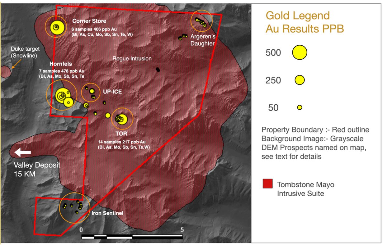 "The systems found are associated with the Rogue Intrusion and associated hornfels sediments. The Rogue Intrusion is the largest Mayo-suite intrusion in the district, the same intrusive cluster that also hosts Snowline Gold's Valley deposit 15km to the west."