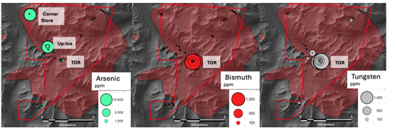 Assays showed high levels of pathfinder elements - bismuth, arsenic, copper, molybdenum and tungsten - with bismuth and arsenic reporting over limits (>10,000 ppm) and tungsten reporting up to 2,920 ppm.