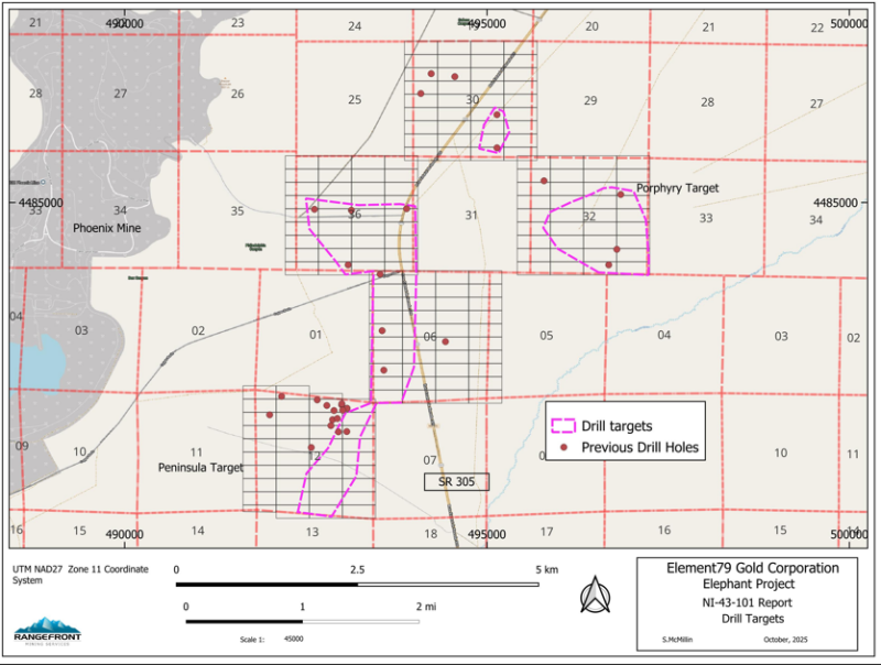 “This Report further highlights the potential of the Elephant Project, supporting the Company’s intention to advance a systematic exploration program aimed at expanding on past work and unlocking the project’s full potential in a district that already hosts tier-one operations,” commented Michael Smith, CEO of Element79 Gold Corp. “With high-grade gold intervals reported in historical core and geophysical signatures consistent with sulfide mineralization, our focus is on smart meters that test the heart of this system.”