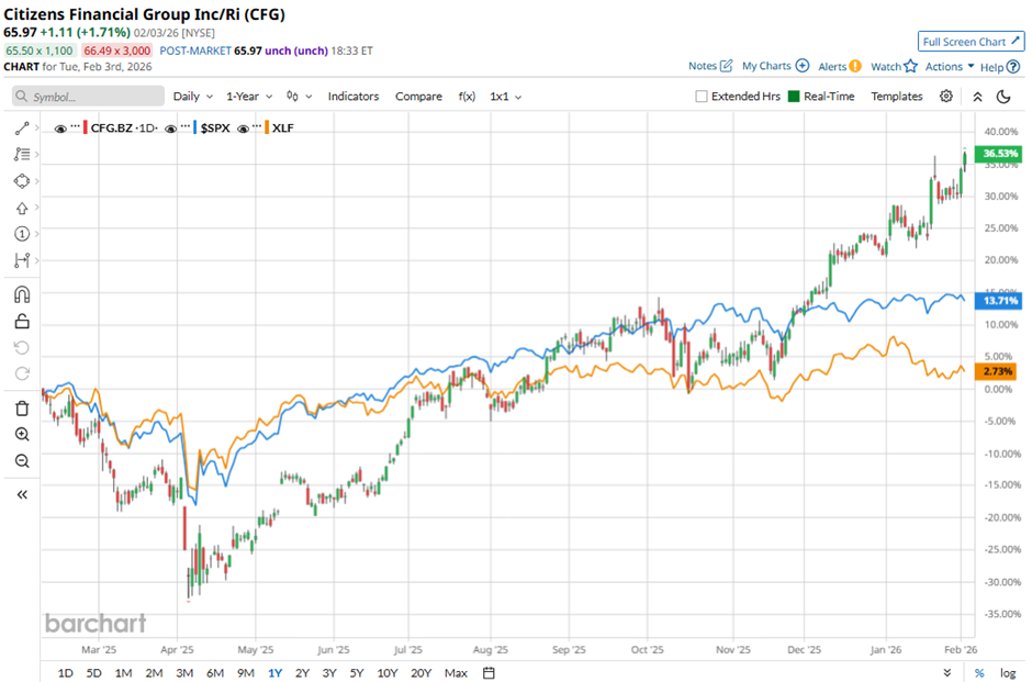 The Providence, Rhode Island-based company's shares have outperformed the broader market over the past 52 weeks. CFG stock has surged 42.3% over this time frame, while the broader S&P 500 Index ($SPX) has rallied 15.4%. Moreover, shares of Citizens Financial are up 12.9% on a YTD basis, compared to SPX’s 1.1% rise.