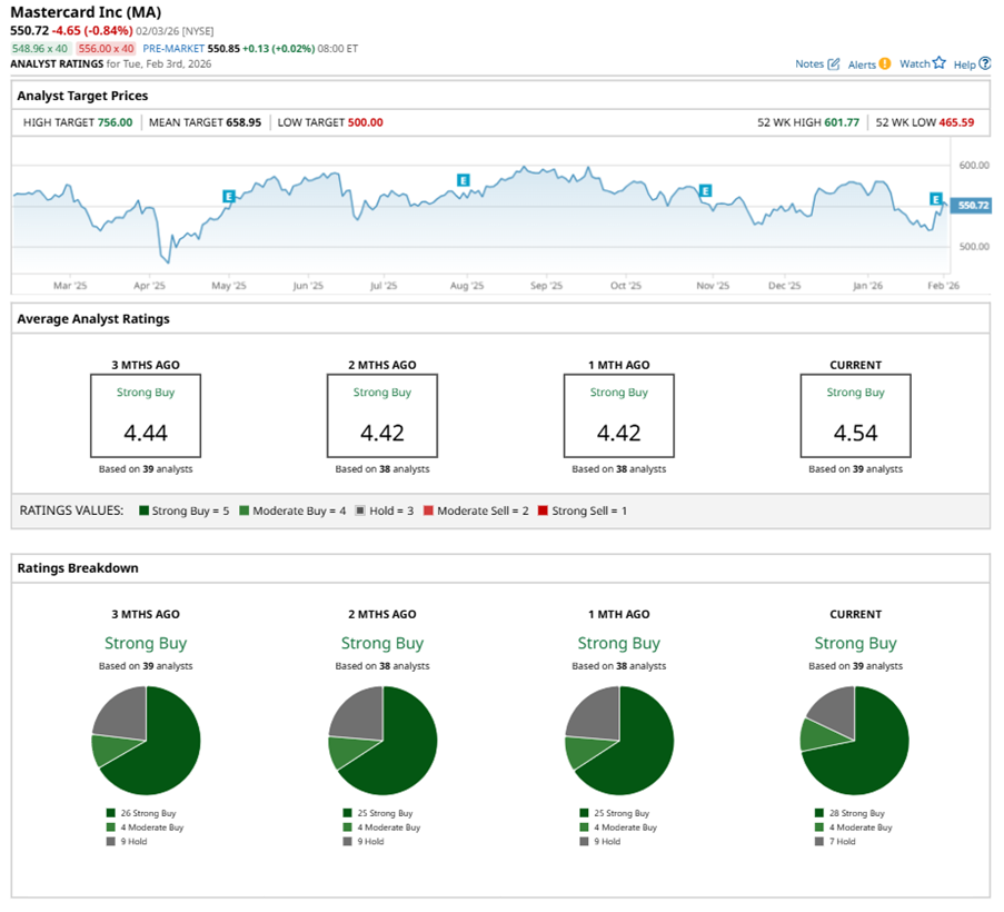 Among the 39 analysts covering MA stock, the consensus is a “Strong Buy.” That’s based on 28 “Strong Buy” ratings, four “Moderate Buys,” and seven “Holds.”