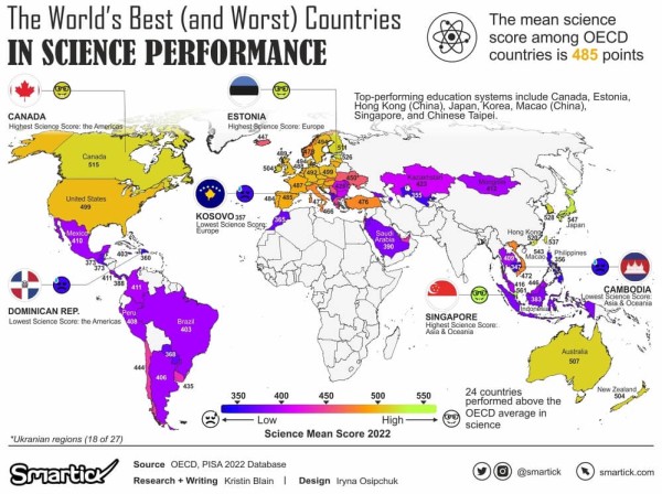 Scientific performance in PISA evaluates the ability of 15-year-olds to utilize scientific knowledge for questioning, acquiring new insights, explaining phenomena, and drawing evidence-based conclusions on science-related matters. The map provides a visual representation of country performances and data insights.