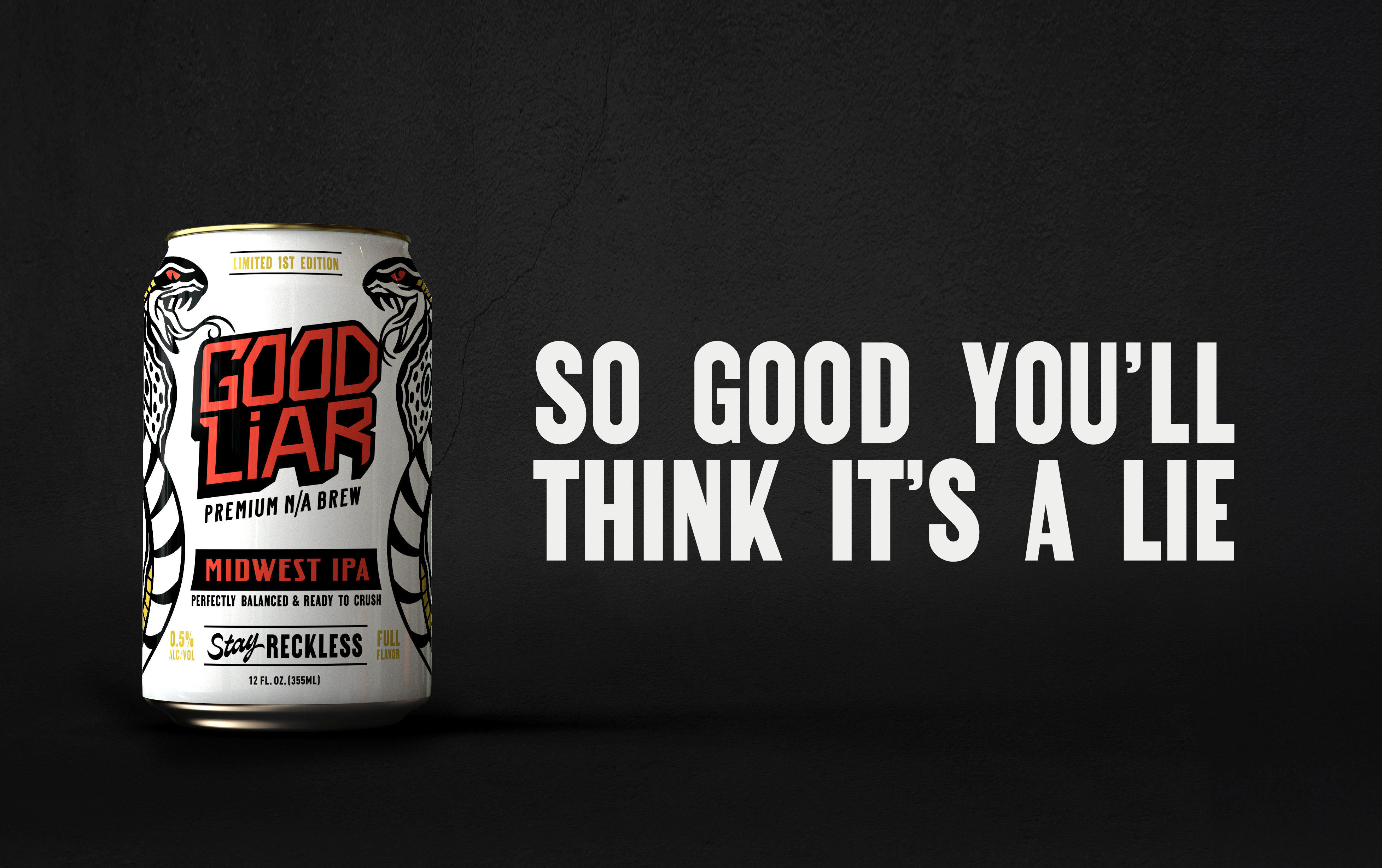 Good Liar Midwest IPA is the brand’s debut brew, with more styles to follow. The packaging broadcasts the irreverence of a brand, that despite all its uniqueness, can appeal to drinkers who are dry, dry-ish, and absolutely dry-ambivalent. “We sought to create not only a good NA beer,” Ziehm adds, “But a damn good beer. Period.”