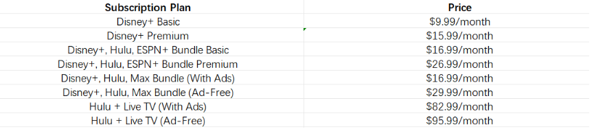 Disney+ offers multiple pricing options based on the subscription plan. In August 2025, the U.S. has two main plans, Disney Plus Basic and Disney Plus Premium, plus six bundles. Prices are shown in the table below: