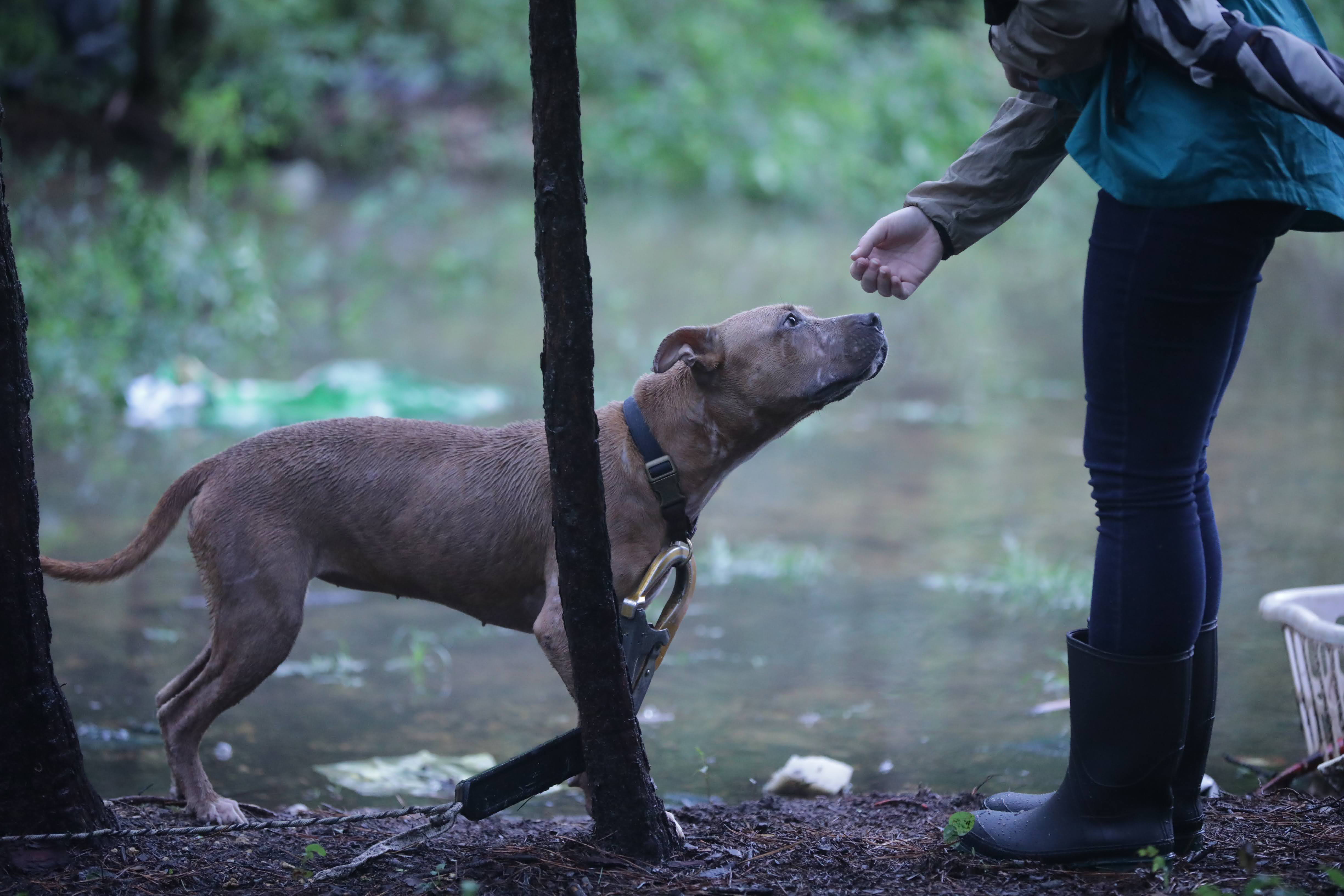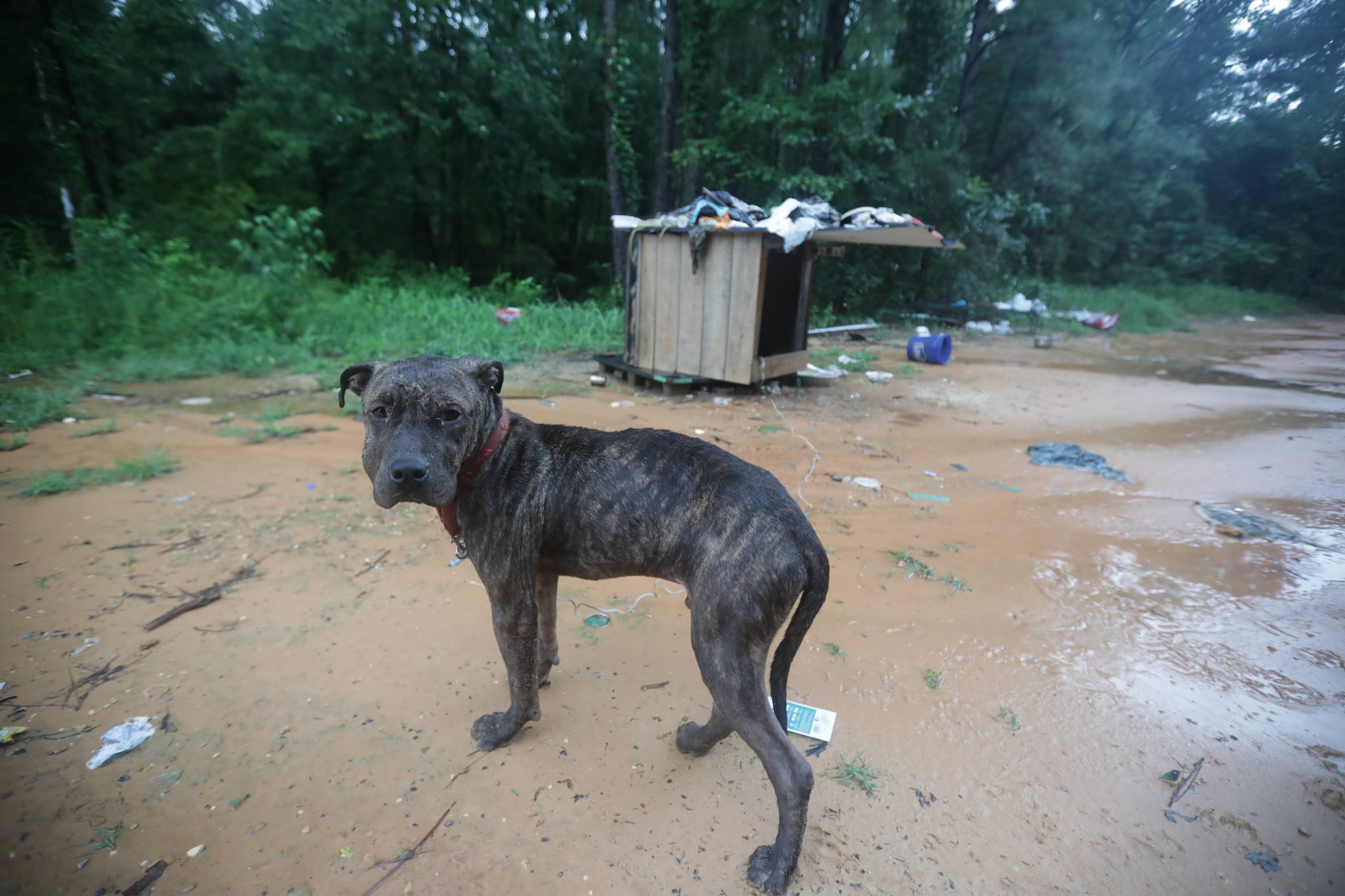 Responders found dozens of dogs chained outdoors to trees, trapped in outdoor cages and camping tents, and several more running loose around the nine-acre, trash-strewn property. The dogs had been without access to food, clean water, or necessary veterinary care. On a separate property, over 40 dogs were found running loose and inside a trailer. Over a dozen dead and decomposing carcasses were found in cages and scattered around the property. Two emaciated dogs had to be immediately euthanized due to untreated medical conditions that were too advanced to be treated.