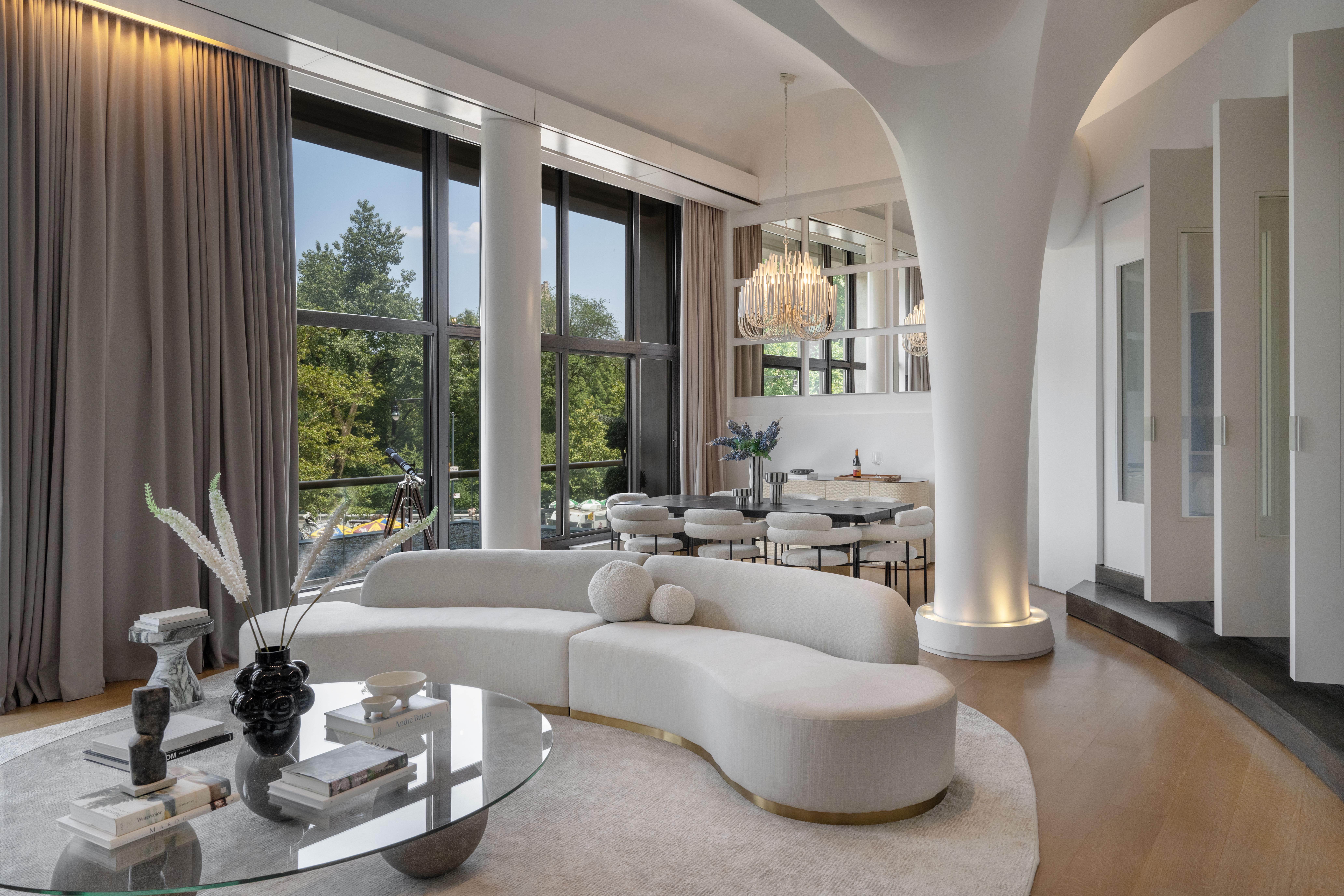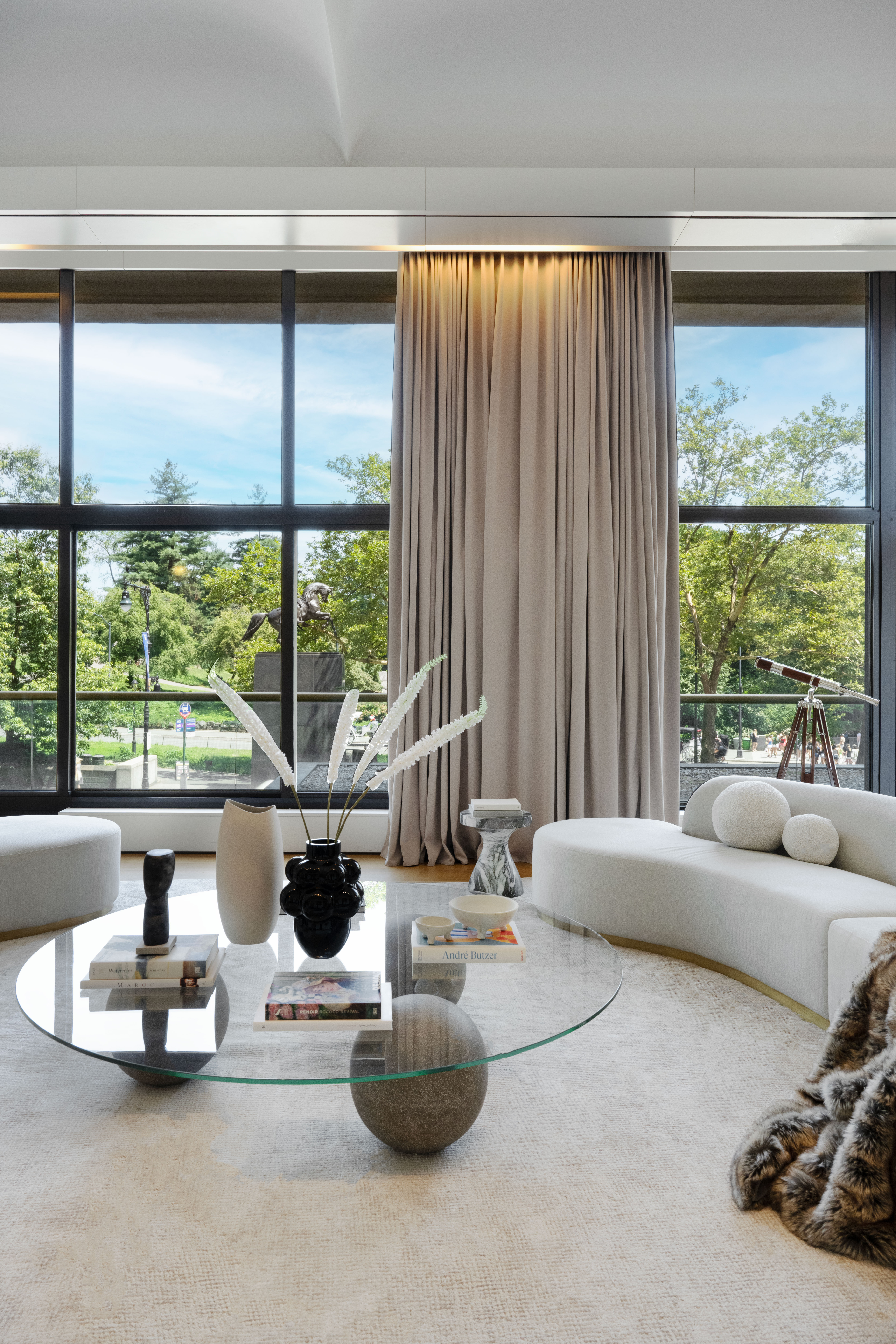 The home's multi-function living space boasts unique architectural features, including 15-foot-high curved ceilings and tapered columns inspired by Spanish architect Antoni Gaudí in the main living space. "We chose low-profile curved sofas in subtle grey upholstery to compliment the inherent visual interest of this room and the jaw-dropping views of Central Park through the soundproof floor-to-ceiling windows," explains Cheryl Eisen, founder of IMG.