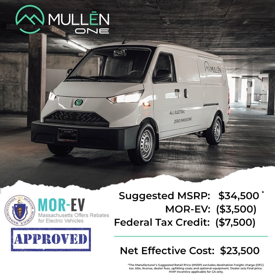 Under the MOR-EV program, the Mullen ONE Class 1 EV cargo van, with a suggested MSRP of $34,500, is now approved for a MA state cash rebate of up to $3,500