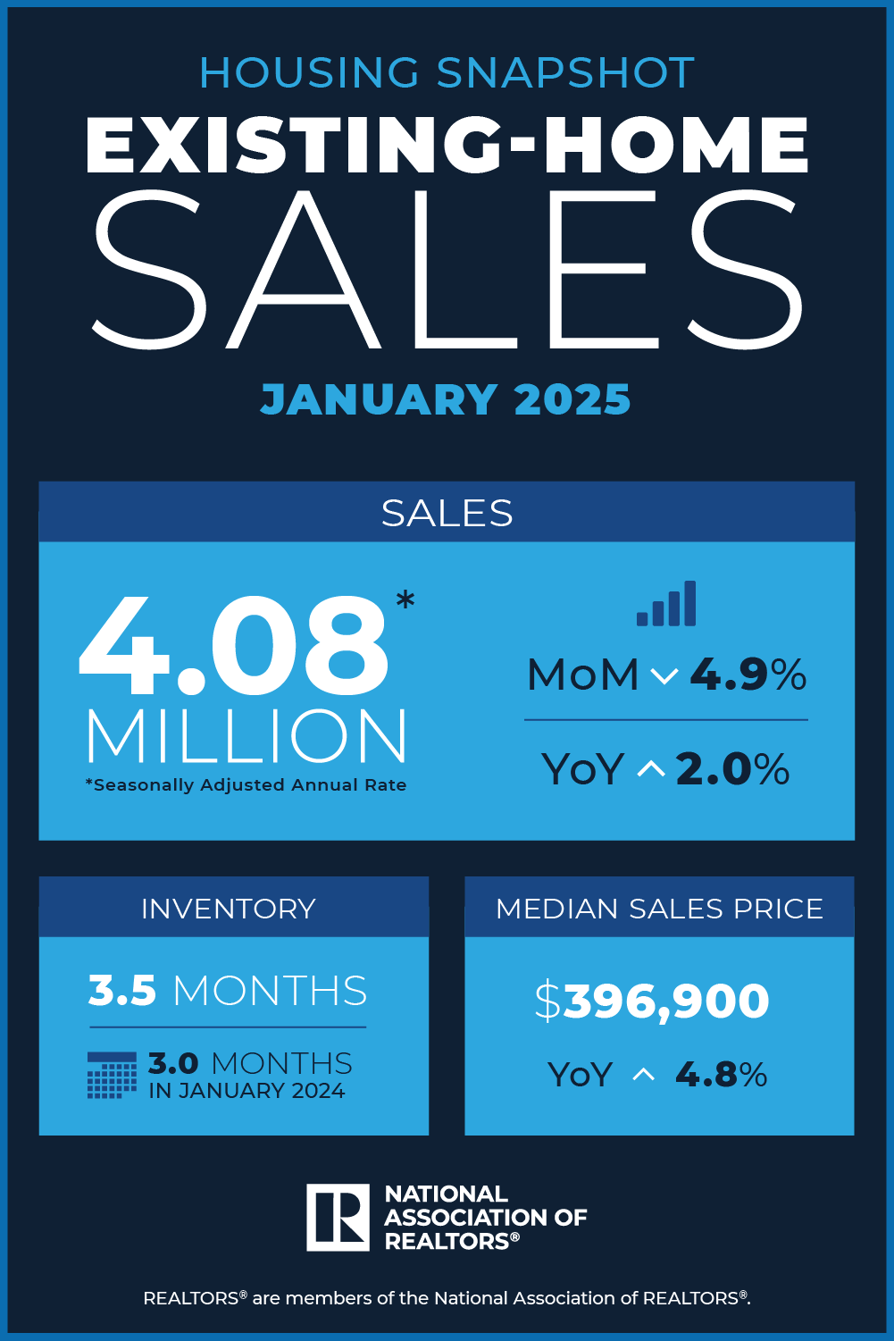 Single-family home sales declined 5.2% to a seasonally adjusted annual rate of 3.68 million in January, up 2.2% from the previous year. The median existing single-family home price was $402,000 in January, up 5.0% from January 2024.